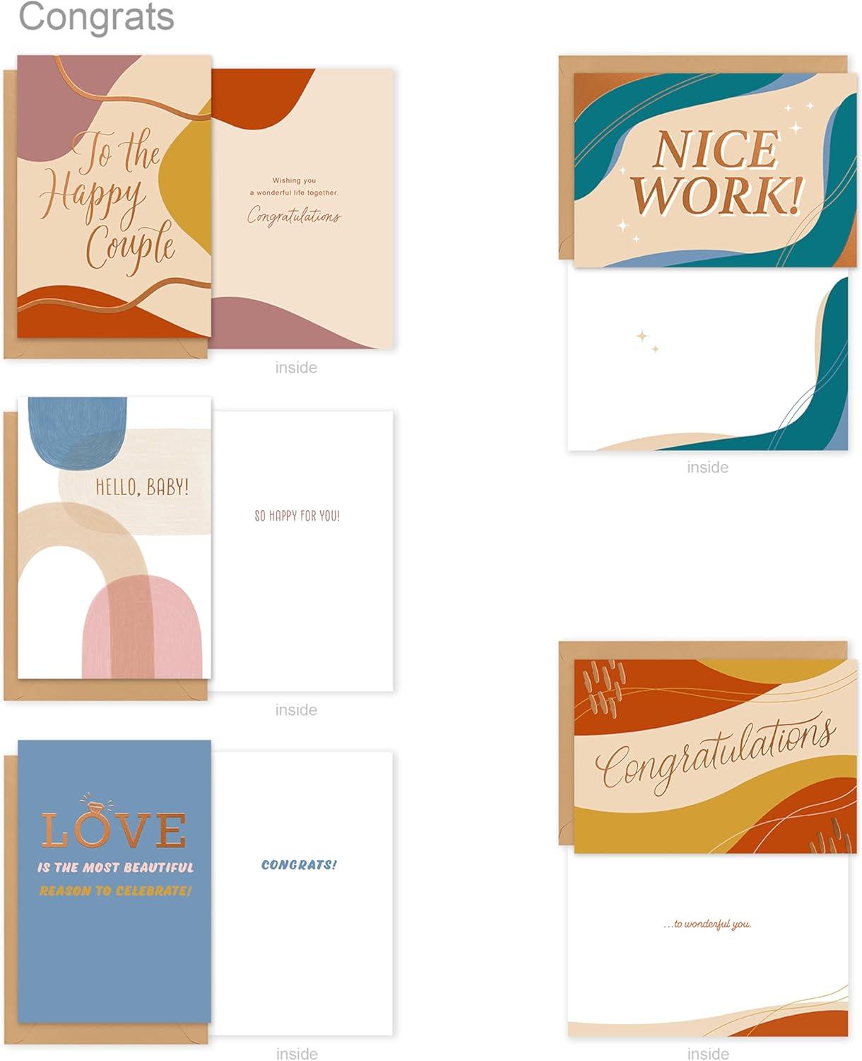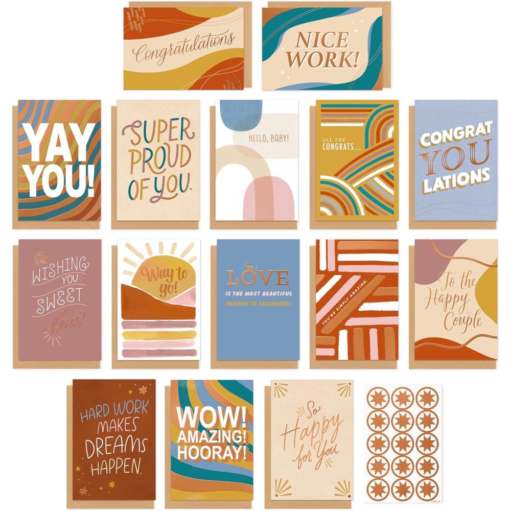 This greeting card bundle features 15 cards for general congrats (11), baby congrats (2), and wedding congrats (2)