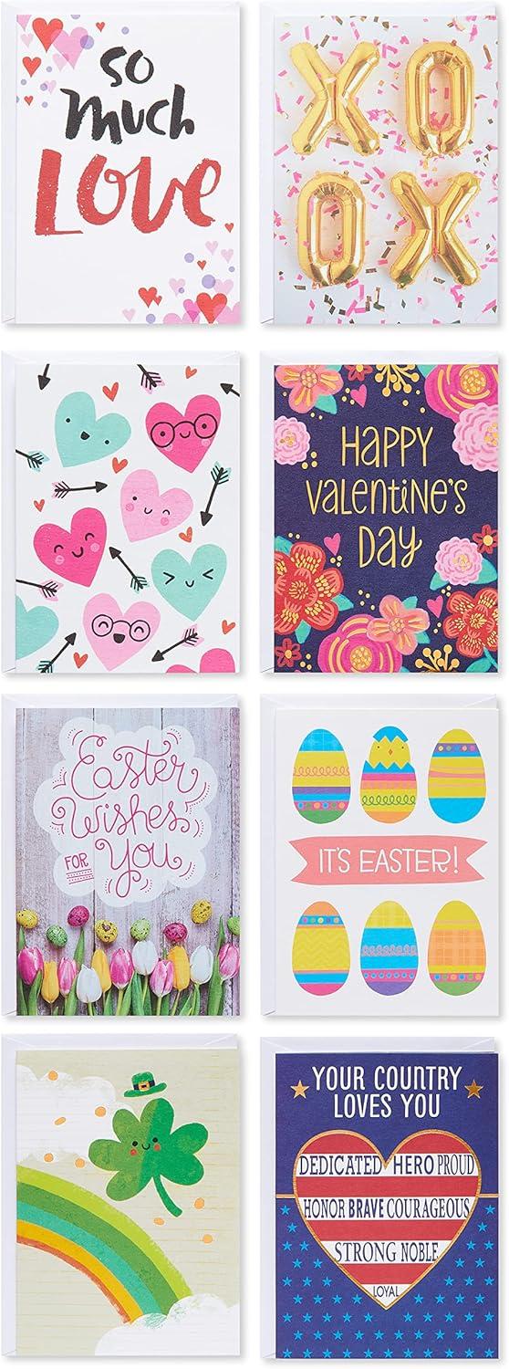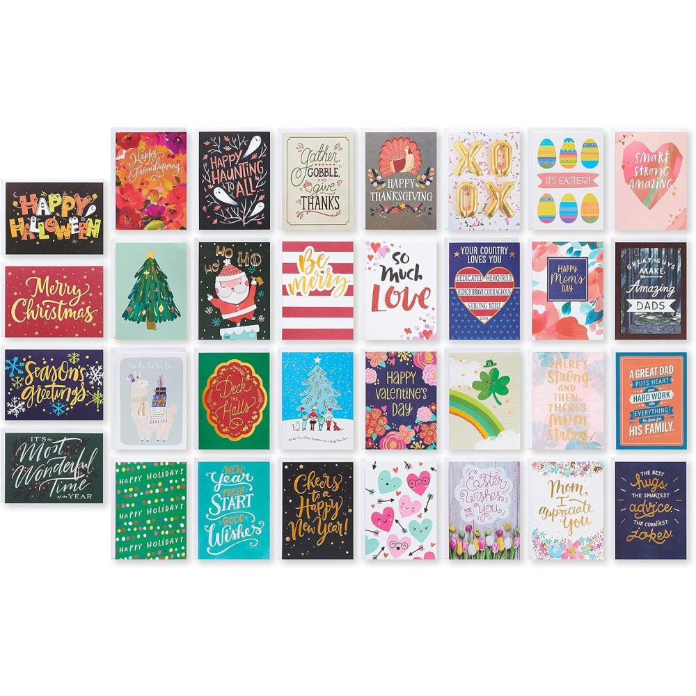 This deluxe assortment includes 32 bright and cheerful, Christmas, Halloween, Thanksgiving, Valentine’s Day, St. Patrick’s Day, Mother’s Day, Father’s Day, and Easter Cards