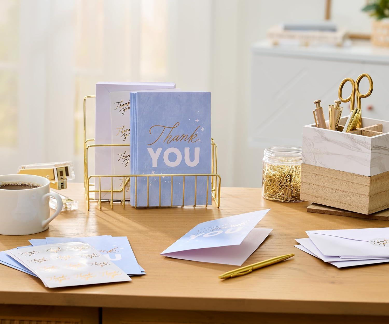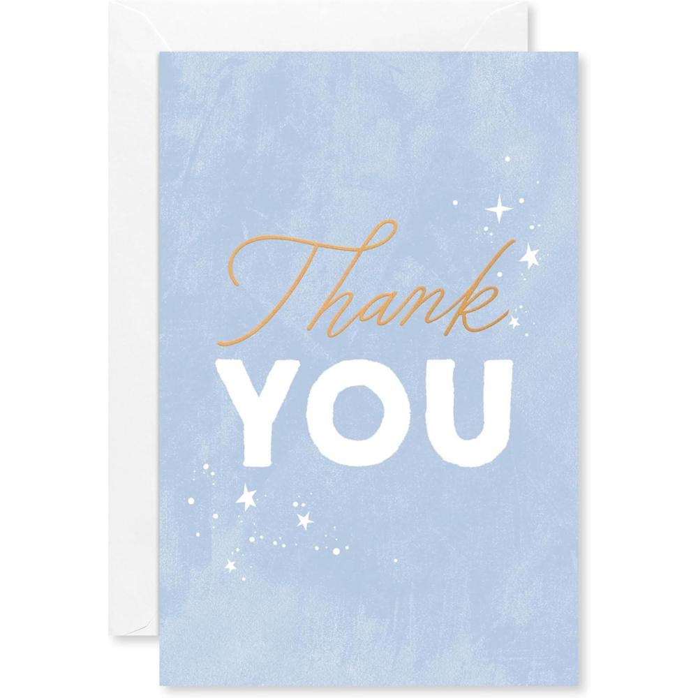 Elegantly designed thank you cards features gold foil lettering and stars on a soft blue background perfect for sending a special note after baby showers, weddings, graduations, and more