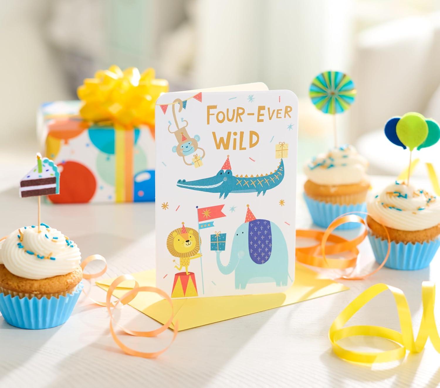 This delightful birthday card features vibrant circus animals with foil accents, perfect for a special four-year-old's birthday celebration