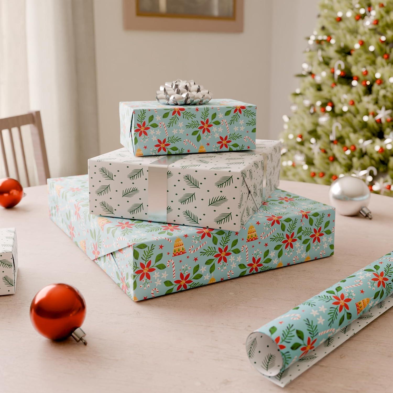 DESIGN & FINISHINGS: This holiday wrapping paper features bells, florals, and candy canes on a blue background on the front with green florals and polka dots on a white background on the back. Reversible wrapping paper rolls provide two charming designs in one roll, maximizing your wrapping possibilities.