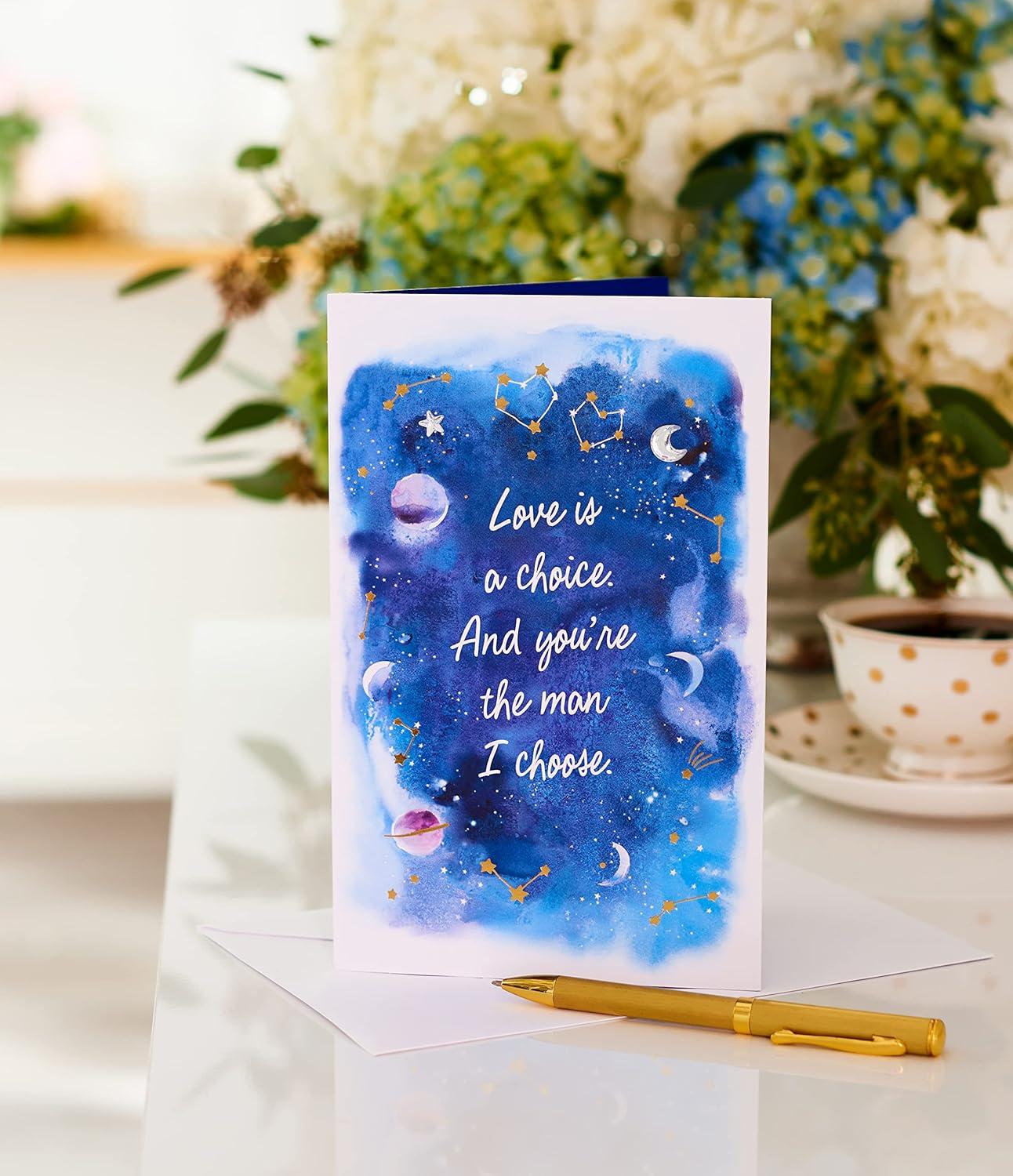 Express your forever love to the man in your life with this romantic Anniversary card! Perfect for Boyfriend or Husband. Celestial design in dreamy blues is embellished with metallic foil accents among the stars and planets. Simple yet powerful message expresses the certainty of your love. Let him know how much he means to you! White envelope included.
