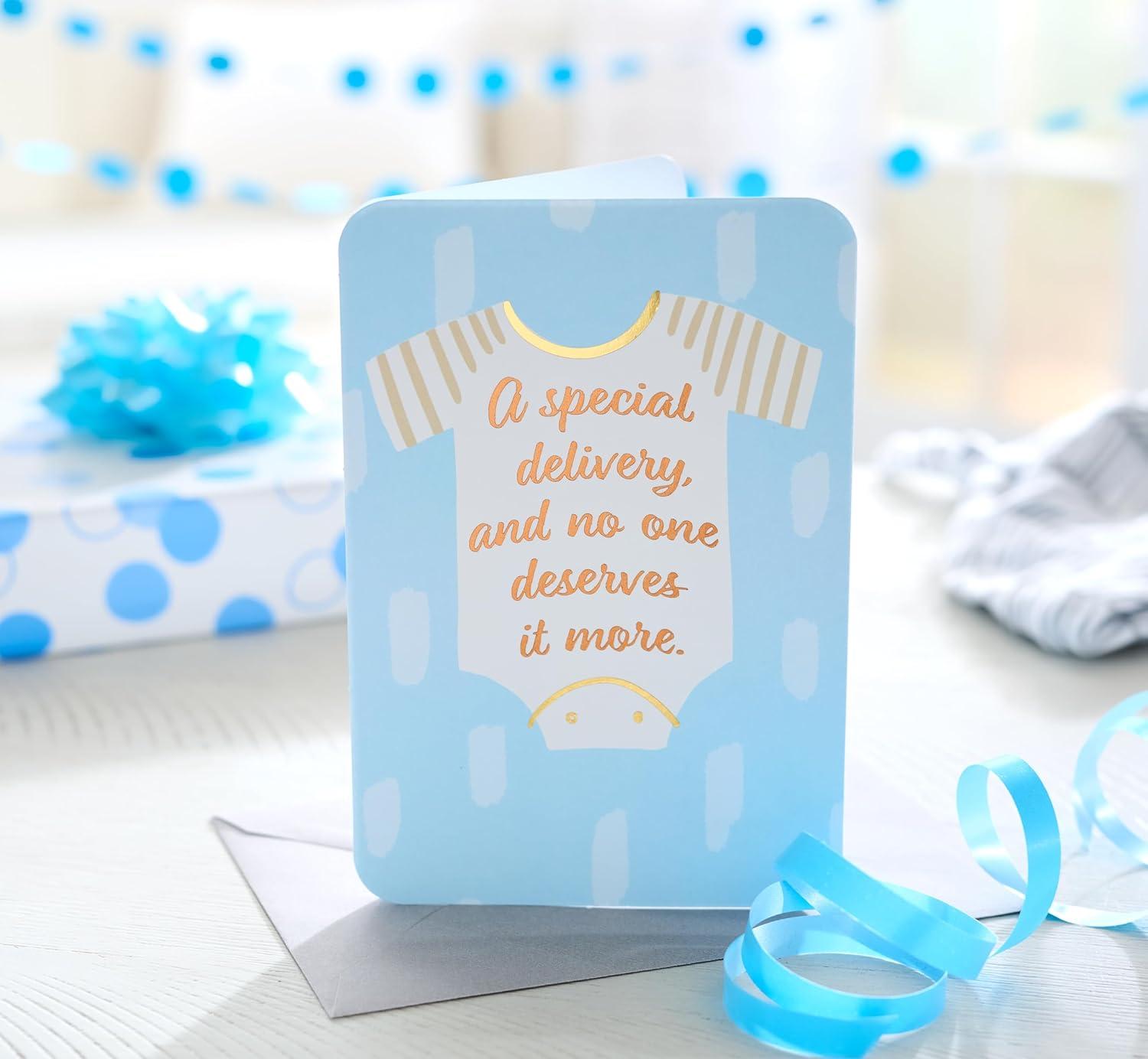 Celebrate the joy of adoption finalization with this beautiful new baby card. The front features a charming baby onesie design and the sentiment, 'A special delivery, and no one deserves it more.' Inside, it expresses your heartfelt congratulations on welcoming new love into their lives. Crafted with a tasteful touch of foil, this card is a memorable way to honor this incredible milestone. Envelope included for easy sending. American Greetings offers exceptional greeting cards, gift wrap and celebration products so you can connect in ways that fit your personality and authentic style.