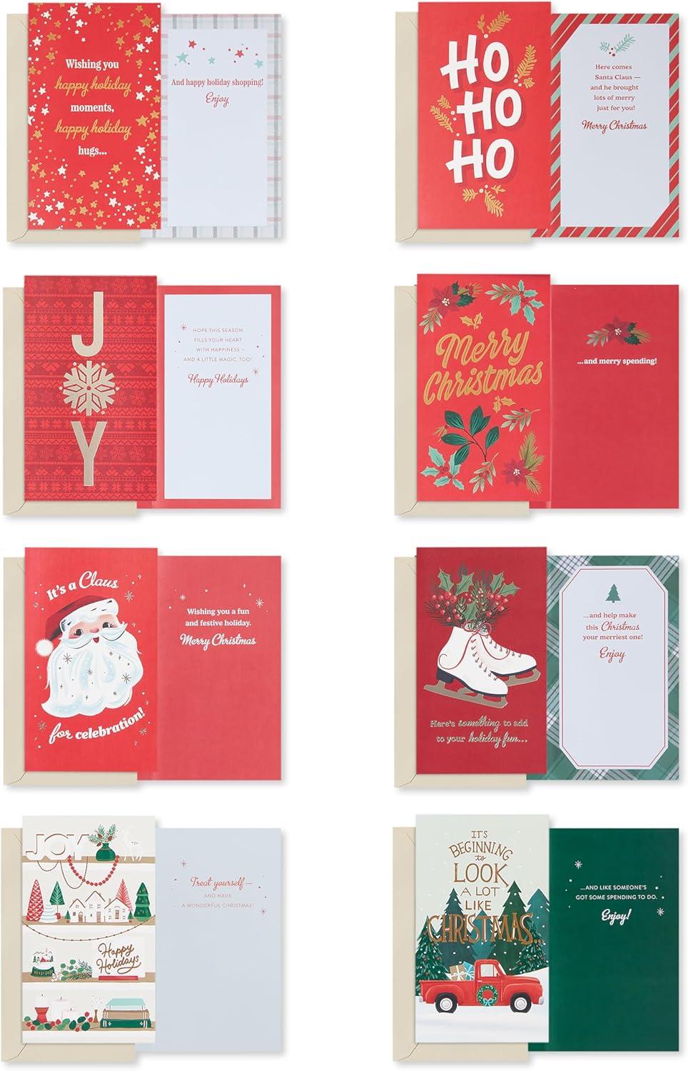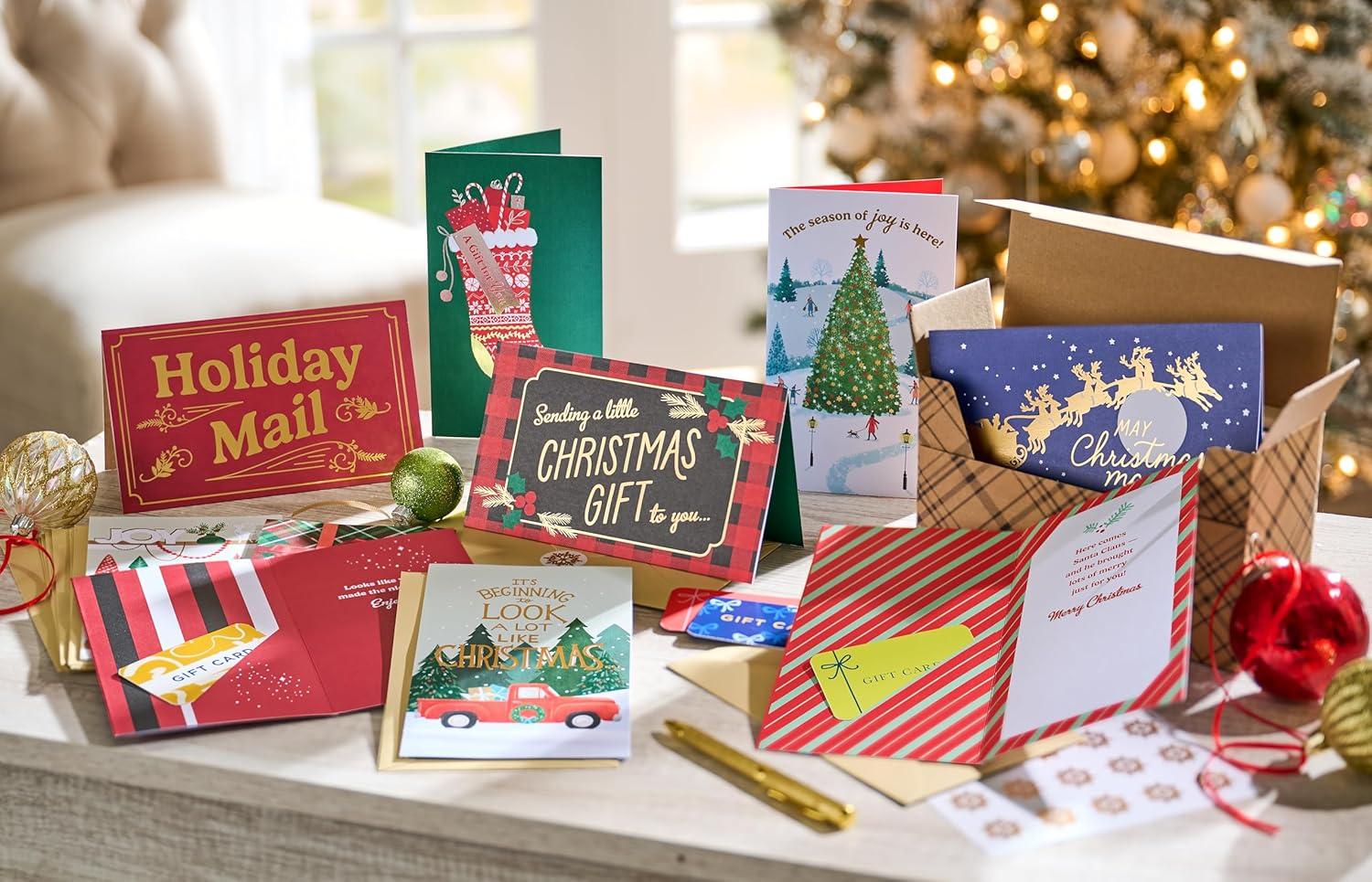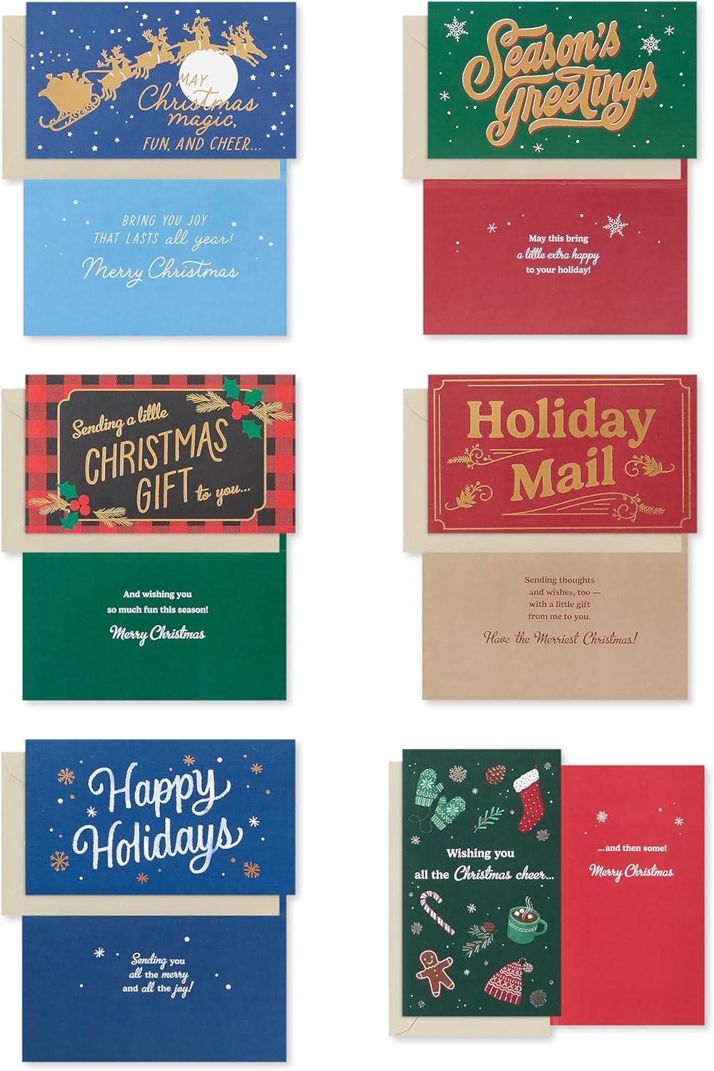This American Greetings holiday card bundle includes many cards featuring shimmering foils, a festive message inside, and a slot to put money, gift cards, or a check