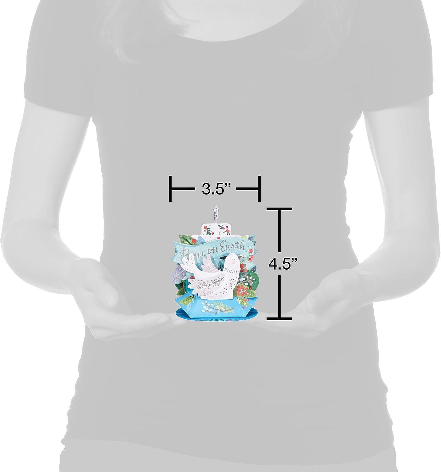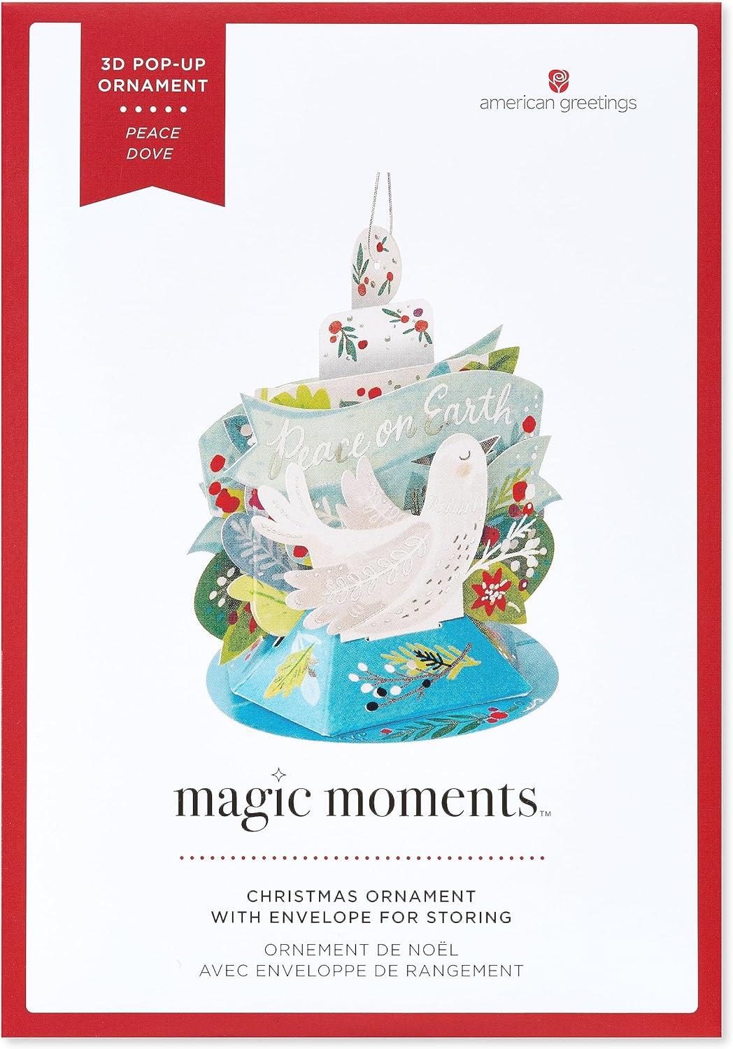 Surprise someone special with this beautiful Magic Moments Pop-Up Christmas Ornament Decoration! This collectible keepsake stands almost 7 inches high and over 4.5 inches wide, and features a dove surrounded by colorful Christmas foliage and a “Peace on Earth” holiday message. Simple assembly instructions are included, which involve merely pushing up from the bottom to unfold the ornament and rotating a tab to lock it into place. Whether it’s placed on a mantle or hung from a Christmas tree, this eye-catching collectible is a great way of sharing and celebrating the spirit of the season! An envelope for this displayable Magic Moments Pop-Up Ornament Decoration is included.