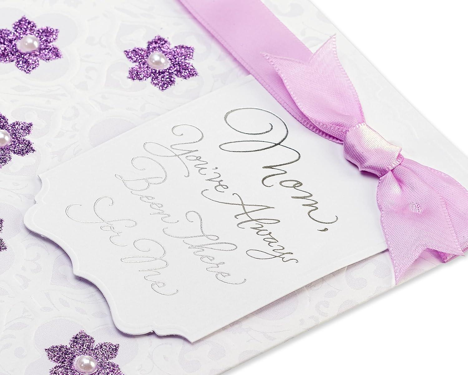 Let mom know just how much you appreciate her with this beautiful Mother’s Day card from American Greetings. It features a classic purple and white flower and pearl design with shimmering foil embellishments, embossing, and decorative attachments. Inside, there’s a heartfelt message about all the beautiful things mom has done to make life better for her child. A peach envelope is included.