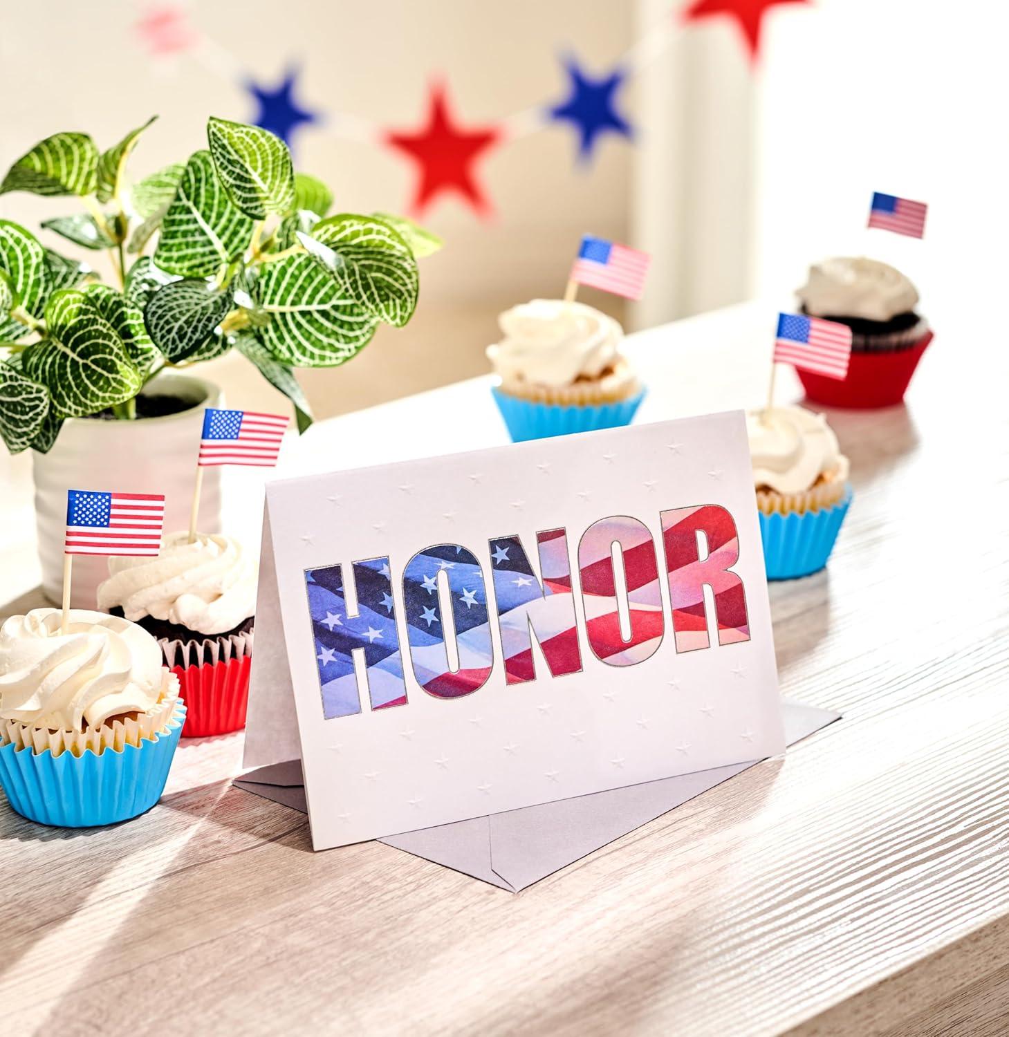 Express your gratitude to a beloved service member with this patriotic thank you card. Adorned with a vibrant array of stars in our national colors and the heartfelt 'Welcome Home' message, this card is perfect for celebrating a homecoming, deployment return, or boot camp graduation. The inside sentiment appreciates their dedication and sacrifice. Whether for an Army, Navy, Marines, or Air Force member, this card will surely touch their hearts. Envelope included. American Greetings offers exceptional greeting cards, gift wrap and celebration products so you can connect in ways that fit your personality and authentic style.