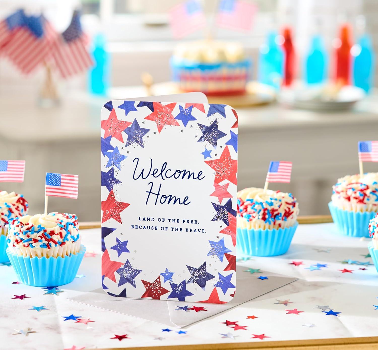 Express your gratitude to a beloved service member with this patriotic thank you card. Adorned with a vibrant array of stars in our national colors and the heartfelt 'Welcome Home' message, this card is perfect for celebrating a homecoming, deployment return, or boot camp graduation. The inside sentiment appreciates their dedication and sacrifice. Whether for an Army, Navy, Marines, or Air Force member, this card will surely touch their hearts. Envelope included. American Greetings offers exceptional greeting cards, gift wrap and celebration products so you can connect in ways that fit your personality and authentic style.