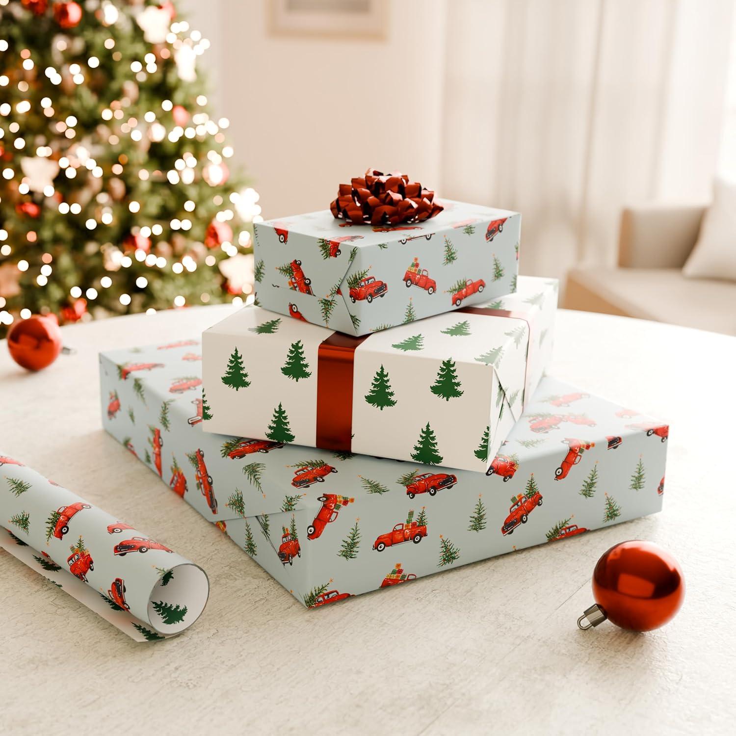 DESIGN & FINISHINGS: This holiday wrapping paper features traditional Christmas imagery with a little red truck hauling festive Christmas trees with a blue background on the front and a classic tree pattern with a white background on the back. Reversible wrapping paper rolls provide two charming designs in one roll, maximizing your wrapping possibilities.