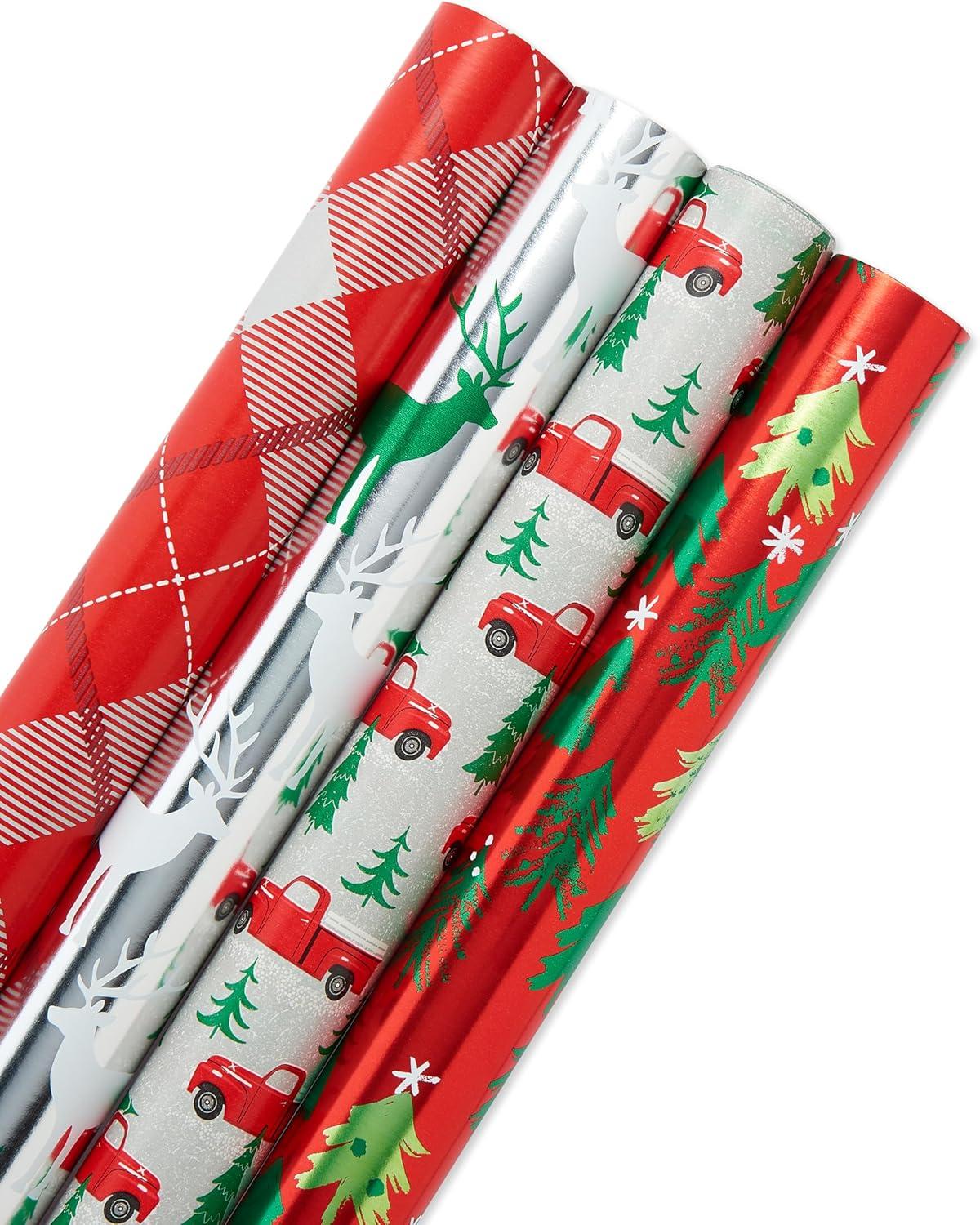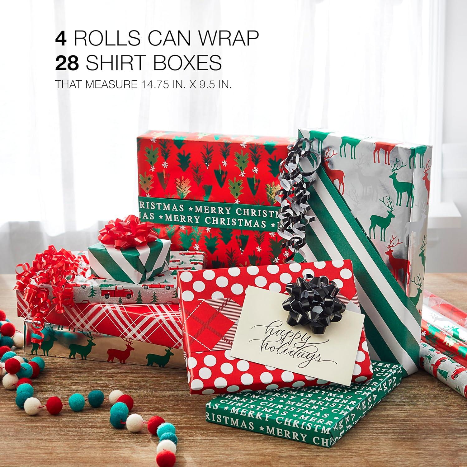 American Greetings Reversible Christmas Wrapping Paper Rolls, Red and Green Holiday Gift Wrap (105 sq. ft., 4 Rolls-30 in. x 12 ft.) Polka Dots, Trees, Snowmen and Snowflakes(Silver Green White Red)