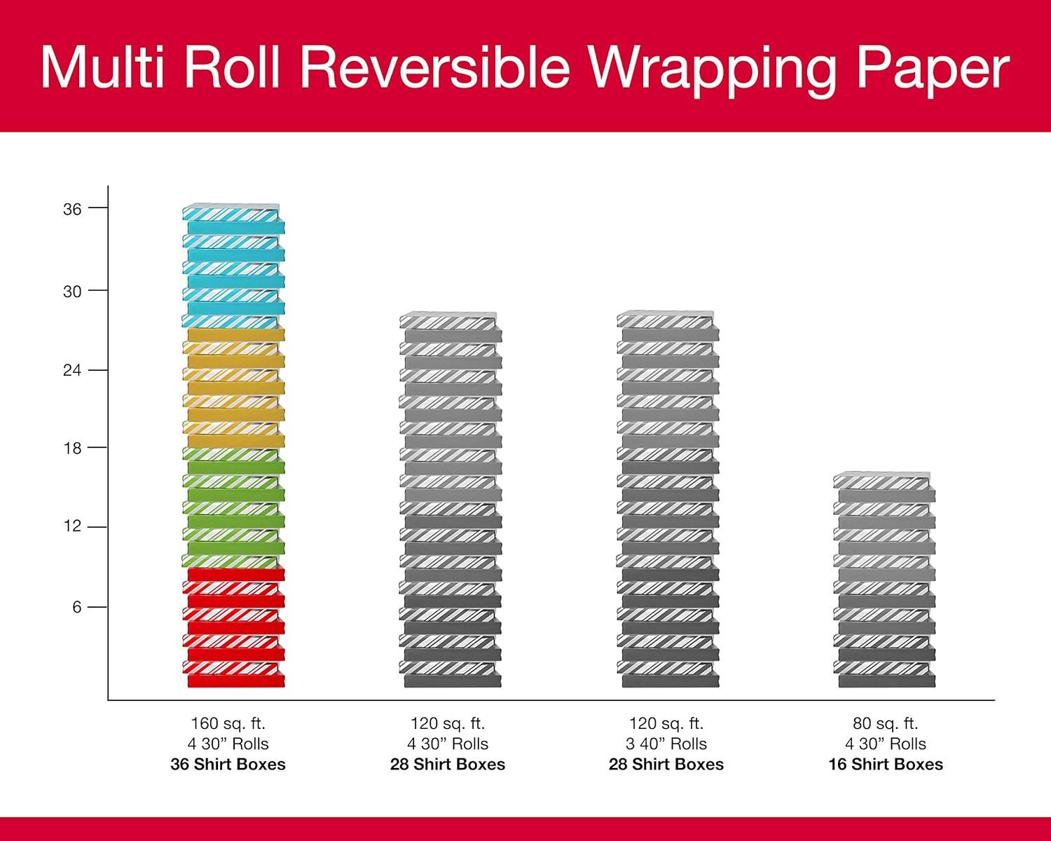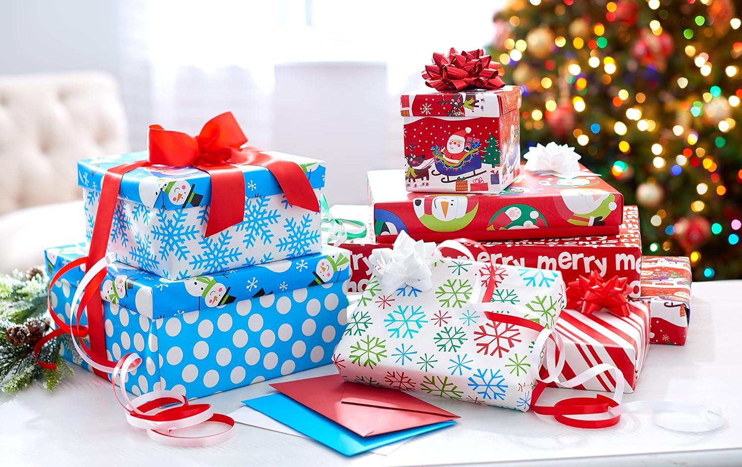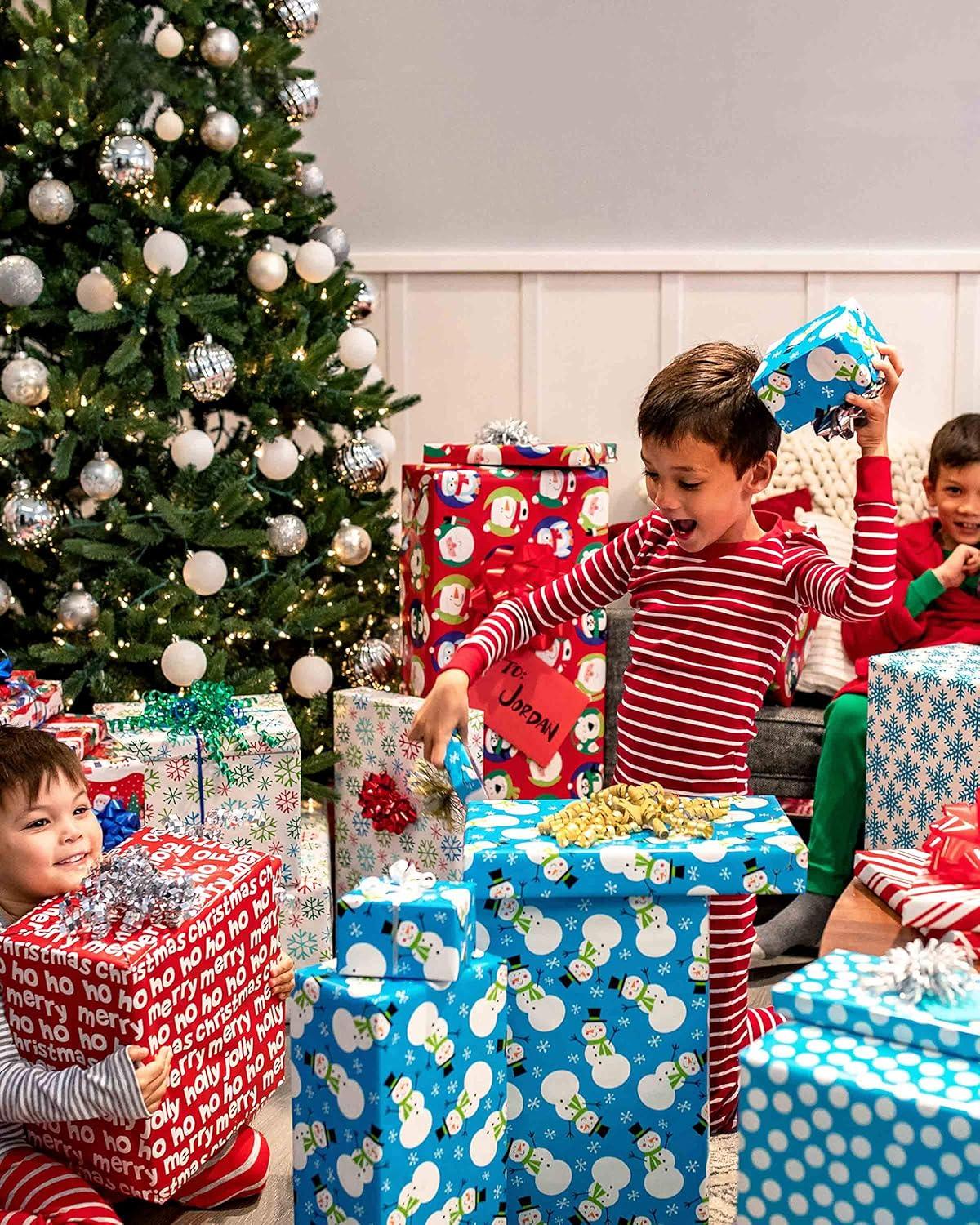 American Greetings Reversible Kids Christmas Wrapping Paper Rolls, Red, Blue, Green Holiday Gift Wrap (120 sq. ft., 3 Wide Rolls-40 in. x 12 ft.) Penguins, Snowmen, Merry Christmas, Ho Ho Ho(Santa Snowflakes and Snowmen)