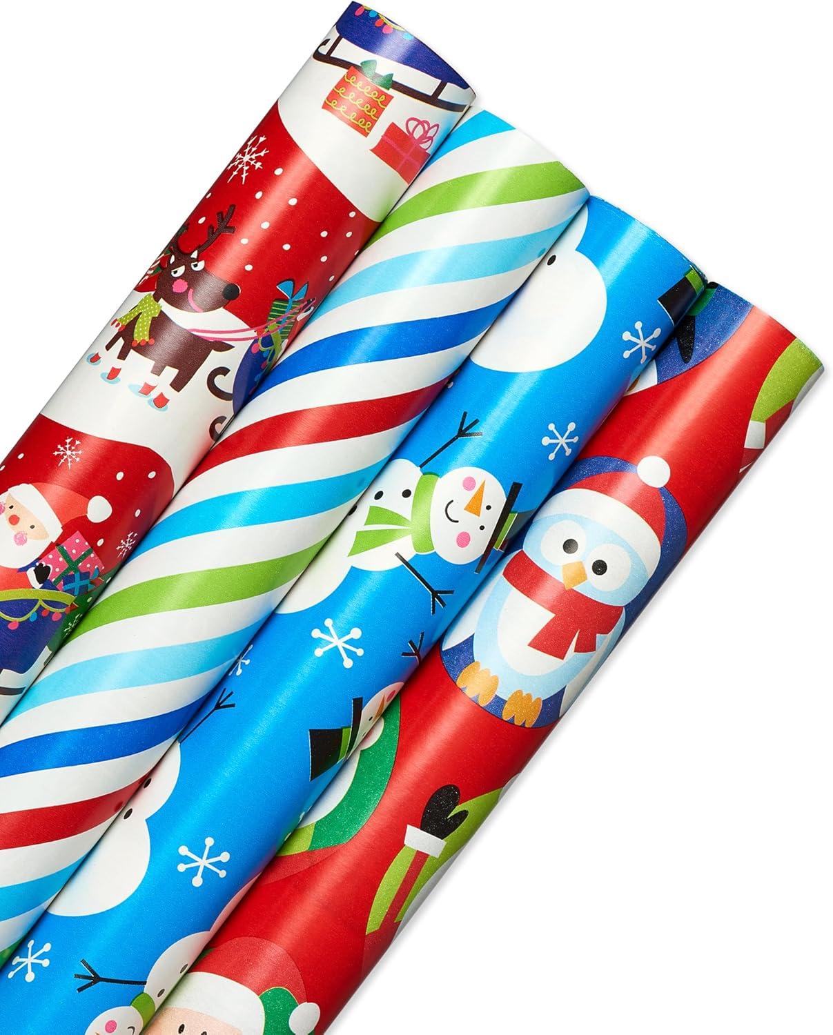 American Greetings Reversible Kids Christmas Wrapping Paper Rolls, Red, Blue, Green Holiday Gift Wrap (120 sq. ft., 3 Wide Rolls-40 in. x 12 ft.) Penguins, Snowmen, Merry Christmas, Ho Ho Ho(WM 4R30 160SQ PR XMAS JUVENILE)