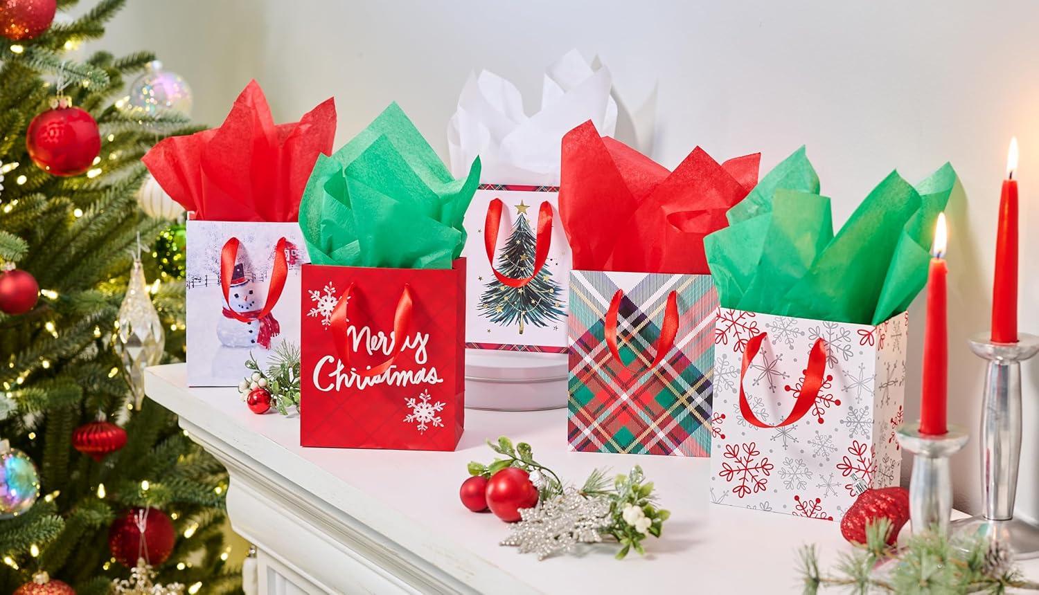 American Greetings Small Christmas Gift Bags for Kids, Animals and Santa (5 Bags)(SM XMAS BAG BUNDLE RDWHTGRN 5CT)